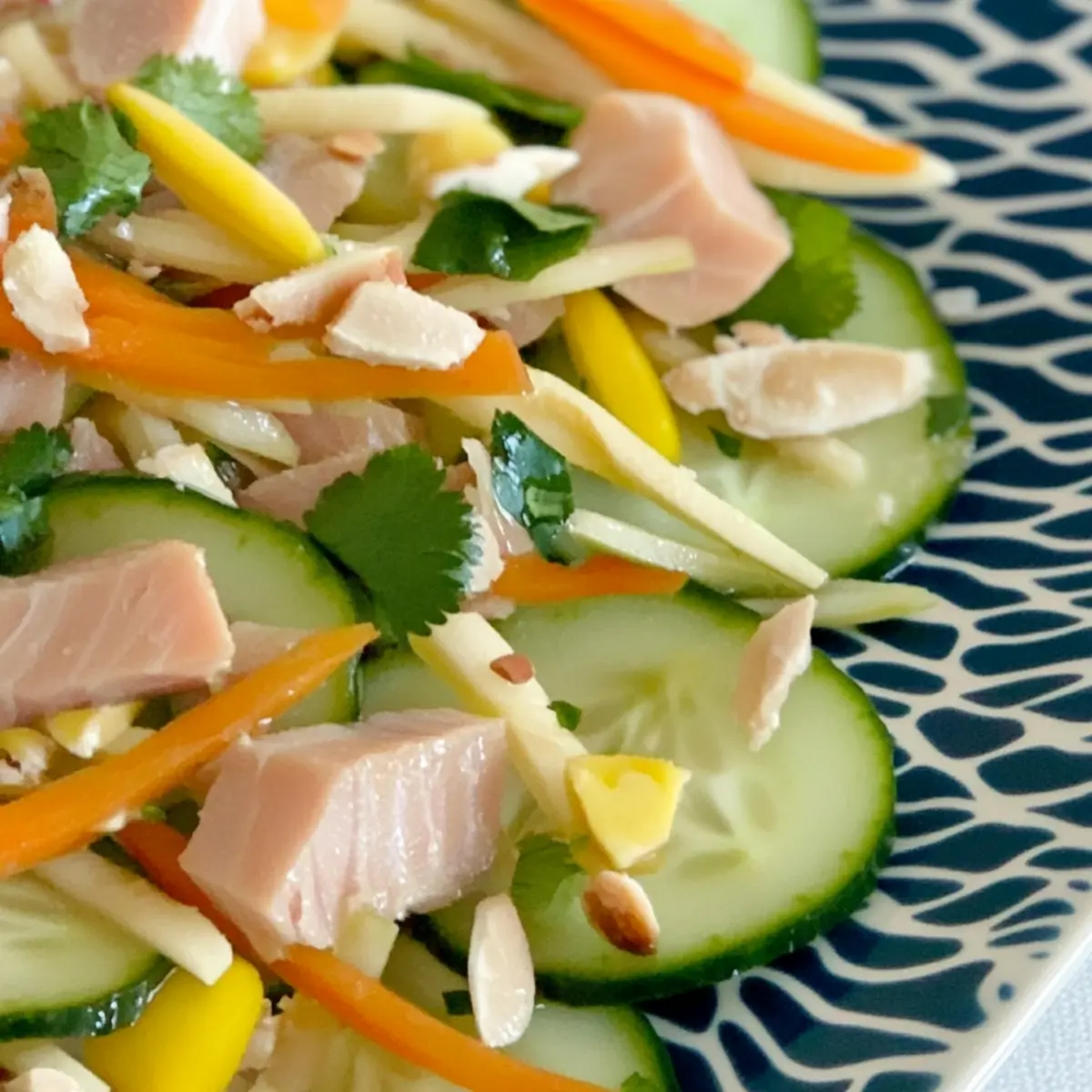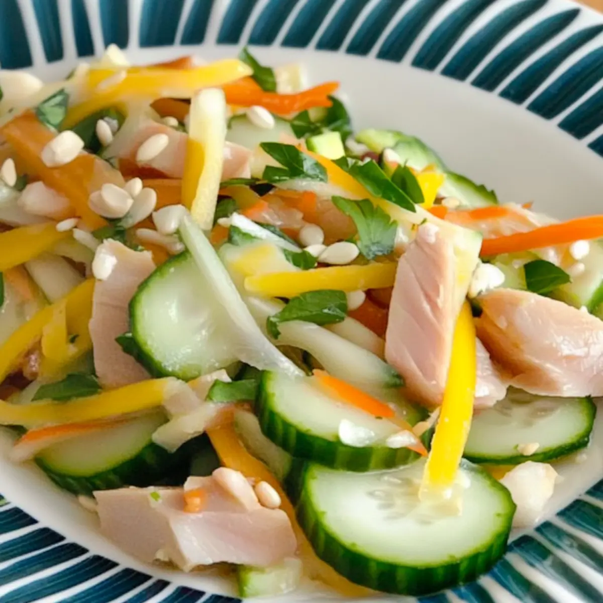 Amid the sweltering heat of summer, each bite of this Tuna Cucumber Salad is like a cool breeze on a sun-drenched day. The combination of tender tuna and refreshing cucumbers creates a light and zesty dish that keeps things delightful and nutritious. This gluten-free, low-carb recipe is not just a feast for the eyes; it’s also a versatile lifesaver that fits perfectly into busy lunch routines or as a guilt-free snack. With a splash of lemon and a sprinkle of fresh herbs, you’ll elevate your meal in mere minutes. Whether you’re hosting a backyard picnic or looking to rejuvenate your midday break, this salad is sure to impress. Ready to dive into a refreshing world of flavors? Let’s get mixing! Why is this salad a must-try? Freshness at its peak: The crisp cucumbers combined with tender tuna deliver a refreshing crunch in every bite. Nutrient-dense: Packed with high protein and healthy fats, this salad is fantastic for energy boosts throughout the day. Versatile variations: Customize with add-ins like red onion or nuts for an extra flavor kick. Quick prep: Suitable for busy schedules, this dish comes together in minutes—making it perfect for a healthy lunch or late-night snack. Plus, it pairs deliciously with Cucumber Strawberry Salad for a vibrant meal spread! Tuna Cucumber Salad Ingredients • Here’s everything you need to create this refreshing Tuna Cucumber Salad! For the Salad Tuna – Choose fresh sushi-grade tuna or high-quality canned tuna in olive oil for rich flavor. Cucumbers – Peel and slice thinly for optimal crispness and hydration. Fresh Herbs (dill, parsley, mint) – Use a mix for aromatic and vibrant flavor enhancements. Lemon/Lime Juice – Fresh juice adds a zesty brightness to balance the dish. Olive Oil or Yogurt – Choose for creaminess; high-quality oil brings out the best taste. Optional Add-Ins Red Onion – Adds a sharpness; soak in water first to mellow its flavor if desired. Capers – A tangy punch that complements the tuna beautifully. Garlic – Minced garlic enhances flavor; wild card lovers can also consider roasted garlic for sweetness. Each ingredient plays a vital role in bringing the Tuna Cucumber Salad to life, ensuring a delightful experience in every bite! Step‑by‑Step Instructions for Tuna Cucumber Salad Step 1: Prepare Ingredients Begin by selecting your tuna; if using fresh sushi-grade, dice it into bite-sized pieces, or drain and flake the canned tuna. Next, wash and peel the cucumbers, slicing them thinly for maximum crispness. Gather your fresh herbs—such as dill, parsley, and mint—and prepare any additional options like red onion or capers to enhance flavors in your Tuna Cucumber Salad. Step 2: Salt Cucumbers Place the sliced cucumbers in a colander and generously sprinkle them with salt. Allow the cucumbers to sit for about 10-15 minutes to draw out excess moisture. You’ll know they’re ready when they appear slightly wilted but still firm, ensuring a refreshing crunch in your Tuna Cucumber Salad while preventing sogginess. Step 3: Combine Ingredients In a spacious mixing bowl, gently combine the flaked tuna, salted cucumbers, and your chosen herbs and add-ins. Mix with a spatula to ensure an even distribution of flavors. The colors and textures should meld together beautifully, creating a vibrant base for your Tuna Cucumber Salad that promises a deliciously fresh taste. Step 4: Dress the Salad Drizzle the mixture with fresh lemon or lime juice, followed by a splash of high-quality olive oil or a dollop of yogurt for creaminess. Carefully fold the ingredients together with a spoon or spatula, ensuring every component is coated in the dressing. This crucial step adds brightness and depth to your Tuna Cucumber Salad. Step 5: Chill Cover the mixing bowl with plastic wrap or a lid and place it in the refrigerator. Let the Tuna Cucumber Salad chill for about 30 minutes; this resting period allows the flavors to meld and intensify. You’ll notice the aroma filling the air and the salad becoming even more refreshing by the time it’s ready to serve. How to Store and Freeze Tuna Cucumber Salad Fridge: Keep your Tuna Cucumber Salad in an airtight container for up to 1 day. The flavors will meld beautifully, but be sure to toss gently before serving to maintain freshness. Make-Ahead: You can prepare the salad in advance and store it in the fridge. It’s best consumed within a day to ensure the cucumbers remain crisp. Freezer: Freezing this salad is not recommended, as the cucumbers will lose their texture. It’s best enjoyed fresh! Reheating: Simply serve chilled; no reheating is necessary, making it a perfect grab-and-go meal option on hot summer days. Tuna Cucumber Salad: Creative Twists Await Feel free to get playful with this Tuna Cucumber Salad and make it your own! Each variation invites a world of flavors that will tantalize your taste buds. Zucchini Swap: Replace cucumbers with zucchini ribbons for a unique, tender texture that still provides crunch. Crunchy Nuts: Add chopped almonds or sunflower seeds for an unexpected nutty crunch that complements the salad beautifully. Spicy Kick: Mix in a pinch of chili flakes or a dab of wasabi for a fiery twist that will wake up your palate. Creamy Avocado: Incorporate diced avocado for a luscious creaminess that brings a whole new level of richness to the dish. Asian Twist: Use sesame oil instead of olive oil and add a splash of soy sauce for an Asian-inspired flavor profile. Sweet Peas: Stir in fresh or frozen peas for a pop of sweetness and an extra nutrient boost. Herb Explosion: Go beyond the standard herbs by incorporating basil or cilantro for an aromatic uplift that creates even more depth. Mediterranean Flair: Toss in some kalamata olives or feta cheese to give your Tuna Cucumber Salad a delightful Mediterranean spin. Whether you’re enjoying it as a solo snack or serving alongside a fragrant Mediterranean Chickpea Salad, these variations will make each experience