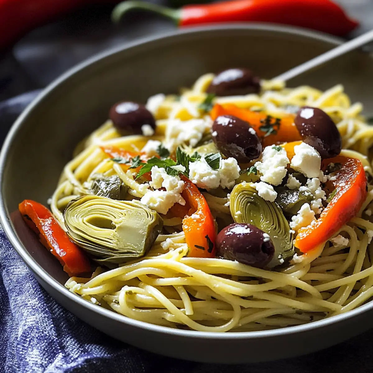Delight in this Vegetarian Mediterranean Pasta with Feta and Artichokes, a quick and vibrant dish bursting with flavor.