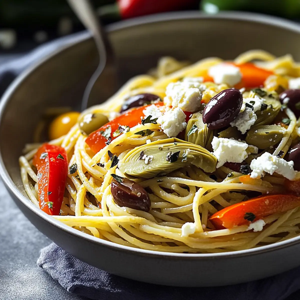 For busy home cooks, this Vegetarian Mediterranean Pasta with Feta and Artichokes is ideal for meal prep! You can chop and store the bell peppers, garlic, scallions, and parsley up to 24 hours ahead, keeping them in airtight containers in the refrigerator to maintain their freshness. The cooked spaghetti can also be made one day in advance; just toss it with a little olive oil to prevent sticking. When you’re ready to serve, simply sauté the prepped vegetables in olive oil, combine them with the pasta, add the marinated artichokes and olives, and finish with lemon juice and feta for deliciously quick results. You’ll have a bright, flavorful dish that feels just as fresh as if you made it that day!
