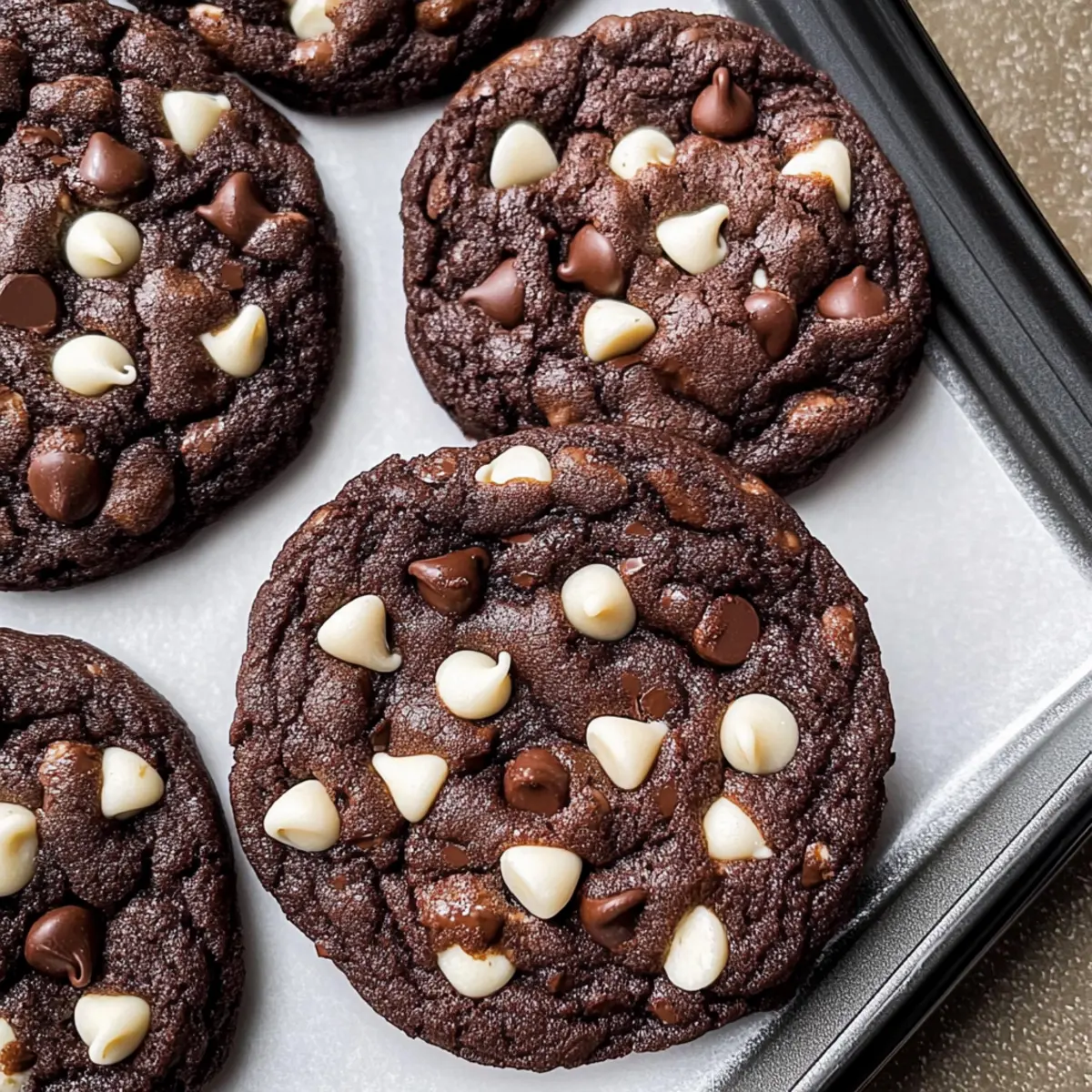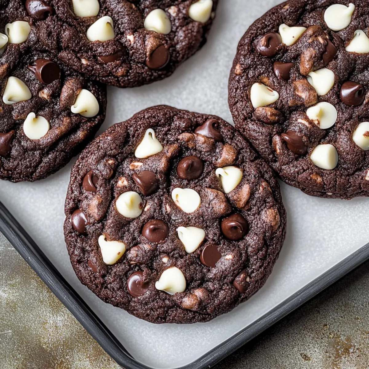 The first whiff of freshly baked cookies can take you back to joyful memories—perhaps your grandmother’s kitchen or a cozy cafe you stumbled upon during a weekend getaway. Today, I’m sharing a recipe for Chewy White Chip Double Chocolate Cookies that can recreate that feeling right in your home! These cookies are not just a classic indulgence; they’re chewy, fudgy gems that marry the sweetness of white chocolate chips with the richness of semi-sweet chocolate. The best part? They’re easy to whip up and guaranteed to impress your friends and family, making them perfect for gatherings or a delightful treat after a long day. Ready to dive into this chocolatey adventure? Let’s bake some memories together! Why are these cookies a must-try? Decadent Flavor: Each bite delivers a rich chocolate experience, thanks to the perfect mix of white and semi-sweet chocolate chips. Chewy Texture: These cookies stay soft and fudgy on the inside, offering a delightful contrast to their slightly crisp edges. Quick and Easy: With simple ingredients and straightforward steps, you’ll have homemade cookies in no time, making it a great choice for any chef or busy home cook. Crowd-Pleaser: Ideal for gatherings or special occasions, they are guaranteed to impress everyone, just like my Decadent Chocolate Peanut Butter Brownies do! Perfect for Pairing: Enjoy them with a glass of cold milk or serve warm as a comforting dessert after dinner. Versatile Options: Feel free to customize your cookies; try adding nuts or experimenting with different types of chocolate as you like! White Chip Double Chocolate Cookie Ingredients • Dive into a rich, chocolatey experience! For the Cookie Dough All-Purpose Flour – Provides structure to the cookies; sift before measuring to prevent lumps. Unsweetened Cocoa Powder – Adds a deep chocolate flavor; use high-quality cocoa for the best taste. Cornstarch – Softens texture for a chewy cookie; can be omitted if not available. Baking Soda – Acts as a leavening agent, helping the cookies rise. Salt – Enhances overall flavor; essential for balancing sweetness. Unsalted Butter – Provides moisture and richness; use at room temperature for optimal creaming. Brown Sugar – Adds moisture and a slight chewiness; pack light or dark for richer caramel notes. White Granulated Sugar – Sweetens the dough and assists in achieving a crisp exterior. Pure Vanilla Extract – Enhances flavor; always use pure for the best results. Semi-Sweet Chocolate – Chopped and melted to integrate intense chocolate flavor within the dough. Large Eggs – Provide moisture and stability; using an egg yolk in addition enhances fudginess. White Chocolate Chips – Adds sweetness and creaminess; Ghirardelli is recommended for the best results. Semi-Sweet Chocolate Chips – Boosts additional chocolate texture and taste in every bite. Step‑by‑Step Instructions for White Chip Double Chocolate Cookies Step 1: Prep Dry Ingredients Begin by sifting together 1 ¼ cups all-purpose flour, ½ cup unsweetened cocoa powder, 1 teaspoon cornstarch, 1 teaspoon baking soda, and ½ teaspoon salt into a medium bowl. This crucial step ensures a smooth and lump-free mixture, setting the foundation for your chewy white chip double chocolate cookies. Set this bowl aside as you prepare the next steps. Step 2: Melt Chocolate In a microwave-safe bowl, combine 4 ounces of chopped semi-sweet chocolate. Microwave on medium power in 20-second intervals, stirring between each until melted and smooth. This process should take about 1 to 2 minutes total. Allow the melted chocolate to cool slightly before adding it to the butter mixture, ensuring it doesn’t melt your butter when combined. Step 3: Cream Butter and Sugars In a large mixing bowl, use a hand mixer or stand mixer to cream together ½ cup unsalted butter, ¾ cup brown sugar, and ¼ cup granulated sugar. Beat on high for about 2 minutes until the mixture is light and fluffy. This incorporates air for a tender cookie texture. Next, add in 1 teaspoon of pure vanilla extract and the cooled melted chocolate, mixing for another 2 minutes. Step 4: Incorporate Eggs Add 1 large egg and 1 additional egg yolk to the chocolate mixture, beating on high speed for about 1 minute until well combined and fluffy. This not only adds richness to the dough but also enhances the fudgy texture of your white chip double chocolate cookies. Scrape down the sides of the bowl to ensure everything is well mixed. Step 5: Combine Ingredients Gradually add the sifted dry ingredients to the wet mixture, mixing on low speed until just combined. Be careful not to overmix; you want a thick dough. Once combined, gently fold in 1 cup of white chocolate chips and ½ cup of semi-sweet chocolate chips using a spatula, ensuring an even distribution throughout the dough. Step 6: Chill Dough Cover the bowl tightly with plastic wrap and chill the cookie dough in the refrigerator for at least 30 minutes. This step is vital for achieving perfect chewy white chip double chocolate cookies, as it helps prevent the cookies from spreading too much while baking. Step 7: Preheat Oven While the dough chills, preheat your oven to 350°F (175°C). Prepare your baking sheets by lining them with parchment paper or silicone baking mats, which guarantee even baking and prevent sticking. This will set the stage for your cookies to bake beautifully. Step 8: Scoop Cookies After chilling, use a 3 oz cookie scoop or a large spoon to portion out the cookie dough onto the prepared baking sheets. Ensure to leave at least 3 inches of space between each ball of dough to allow for spreading. You should be able to fit about 6 cookies per sheet, depending on the size. Step 9: Bake Place the baking sheets in the preheated oven and bake for 13-15 minutes, or until the edges are set and the centers appear slightly soft. This baking time creates that coveted chewy interior. Once done, remove the cookies from the oven and let them coo