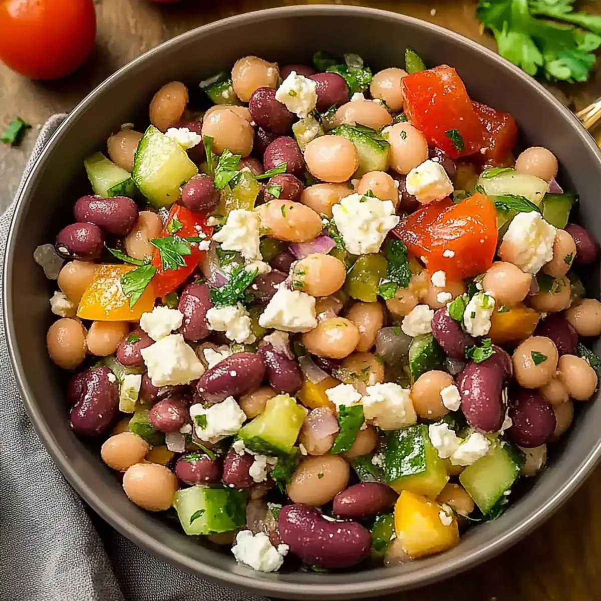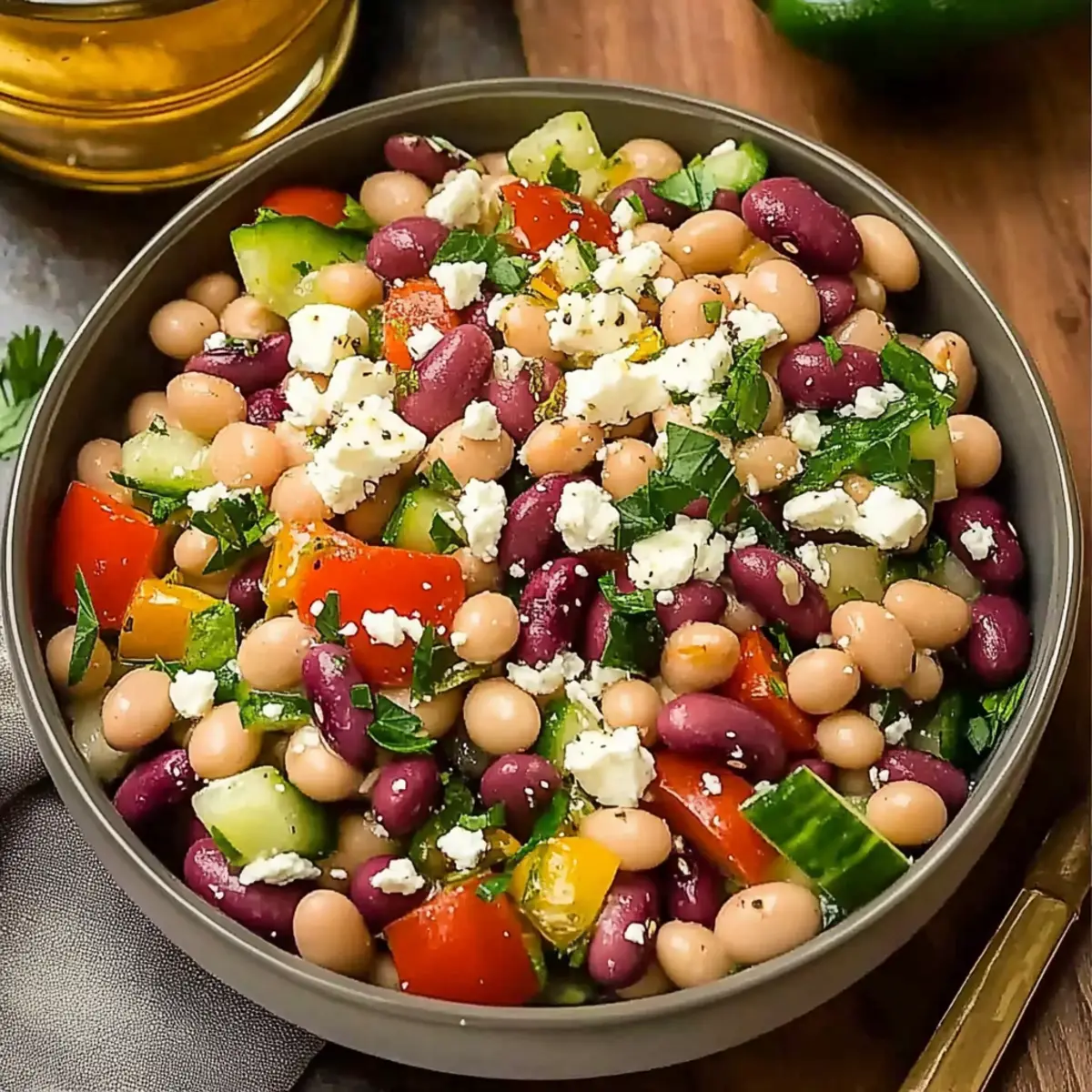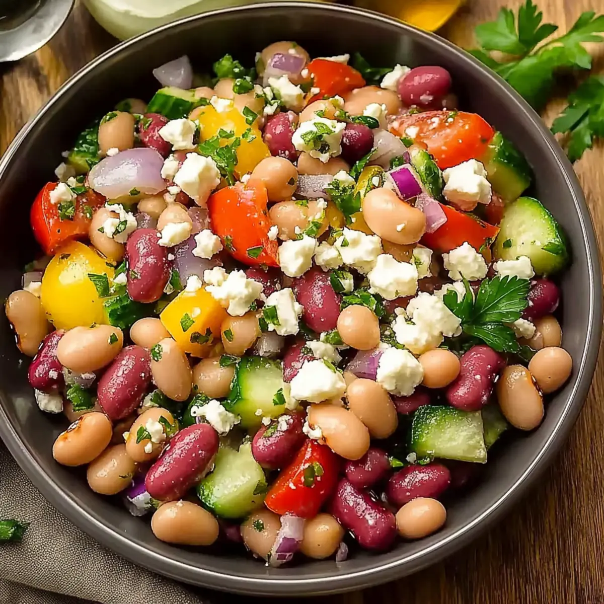 As I combed through my fridge searching for something refreshing yet filling, I stumbled upon a trio of colorful beans that sparked my culinary creativity. It hit me: why not whip up a Zesty Bean Salad with Feta? Not only is this Mediterranean treasure high in protein and perfect for meal prep, but it also transforms simple ingredients into a vibrant dish that can be enjoyed any time of day. With a delightful blend of creamy feta, crisp vegetables, and zesty vinaigrette, this salad is a guilt-free solution to those fast-food cravings. Additionally, it’s incredibly adaptable—use what you have on hand and make it your own! Are you ready to dive into a bowl of this deliciousness? Why is This Bean Salad Perfect? Vibrant, Flavorful Dish: Each ingredient shines, making every bite deliciously refreshing. High-Protein Powerhouse: Packed with three types of beans, it’s a satisfying option for vegetarians and meat-lovers alike. Meal Prep Friendly: Make ahead and store for up to 5 days; flavors only get better! Adaptable Ingredients: Customize with whatever beans or veggies you have, like adding avocado for extra creaminess. Perfect Pairing Options: Enjoy it with grilled chicken or lamb kebabs for a complete meal experience. Guilt-Free Indulgence: This salad is a healthy alternative to fast food, satisfying your cravings with nutritious ingredients. Zesty Bean Salad with Feta Ingredients For the Dressing Olive Oil – Adds richness and acts as the base for the vinaigrette. Substitution: Can use avocado oil for a different flavor. Lemon Juice – Provides acidity and freshness to the dressing. Substitution: Lime juice can be used for a zesty alternative. Red Wine Vinegar – Enhances the depth of flavor in the dressing. Substitution: Apple cider vinegar can be used if preferred. Dijon Mustard – Adds creaminess and a slight tang to the dressing. Substitution: Any mustard variant will work, but adjust quantity as needed. Garlic – Infuses the dressing with aromatic flavor. Note: Mince it finely for even distribution. Oregano – Adds an earthy, herby flavor. Note: Fresh oregano can be substituted with dried if needed. Red Pepper Flakes – Introduces a mild heat to the salad. Substitution: Omit or reduce for a milder taste. Salt and Black Pepper – Essential for seasoning. Note: Use kosher salt for best results. For the Salad Cannellini Beans – The primary bean, providing creaminess and protein. Substitution: Any white beans can be used. Kidney Beans – Adds color and texture. Substitution: Black beans can be a great alternative. Chickpeas – Provide a nutty flavor and additional protein. Note: Can use other legumes as variations. Cucumber – Adds crunch and freshness. Substitution: Zucchini can be used if desired. Cherry Tomatoes – Adds sweetness and juiciness. Substitution: Regular tomatoes, diced, can be used. Bell Pepper – Offers a sweet, crunchy texture. Substitution: Any colored bell pepper will work. Kalamata Olives – Imparts a briny flavor; a Mediterranean classic. Substitution: Green olives can be used as a substitute. Parsley – Adds freshness and color. Substitution: Cilantro can be used for a different flavor. Red Onion – Provides a sharp, crisp bite. Substitution: Sweet onion or green onions can also be used. Basil – Adds a sweet, aromatic touch. Substitution: Italian parsley is a milder alternative. Feta Cheese – Provides creaminess and tang. Substitution: Goat cheese can be used for a softer texture. Step‑by‑Step Instructions for Zesty Bean Salad with Feta Step 1: Prepare Dressing In a small bowl, whisk together ½ cup of olive oil, ¼ cup of freshly squeezed lemon juice, 2 tablespoons of red wine vinegar, and 1 tablespoon of Dijon mustard until the mixture is smooth and emulsified. Add 2 minced garlic cloves, 1 teaspoon of dried oregano, a pinch of red pepper flakes, ½ teaspoon of salt, and ¼ teaspoon of black pepper; mix until well combined. Step 2: Prep Vegetables Next, take a sharp knife and dice 1 cup of cucumber, halve 1 cup of cherry tomatoes, dice 1 bell pepper, slice ½ a red onion, and halve ½ cup of kalamata olives. As you chop, set the vegetables aside in a large mixing bowl. Freshly chop about ¼ cup of parsley and ¼ cup of basil separately, and keep them handy for adding later. Step 3: Combine Beans In a spacious mixing bowl, gently mix together 1 can each of rinsed cannellini beans, kidney beans, and chickpeas. The combination of these three types of beans forms the hearty foundation of your Zesty Bean Salad. Ensure each type of bean is evenly distributed for a balanced texture and flavor throughout the salad. Step 4: Add Vegetables Now, it’s time to incorporate your colorful vegetables into the bean mixture. Gently fold in the prepared cucumber, cherry tomatoes, bell pepper, red onion, and chopped parsley. Be careful not to mash the beans; you want everything to maintain its shape and crunch, contributing to the overall appeal of the salad. Step 5: Dress the Salad Pour the earlier prepared dressing over the combined bean and vegetable mixture. Using a large spoon, lightly toss everything together until the ingredients are coated evenly with the zesty dressing. This step is crucial for ensuring that the flavors meld beautifully into your Zesty Bean Salad with Feta. Step 6: Finish with Feta Just before serving, crumble 1 cup of feta cheese over the salad mixture. Gently fold the feta into the salad to retain its shape. The creamy texture of the feta adds a delightful contrast to the fresh ingredients and enhances the overall flavor profile. Step 7: Taste & Adjust Take a moment to taste your Zesty Bean Salad with Feta and make any necessary adjustments to the seasoning. You can add a pinch more salt or pepper if desired. Let the salad sit for at least 30 minutes in the refrigerator; this allows the flavors to meld together beautifully, creating a more delicious outcome. Make Ahead Options This Zesty Bean Salad with Feta is a fantastic c